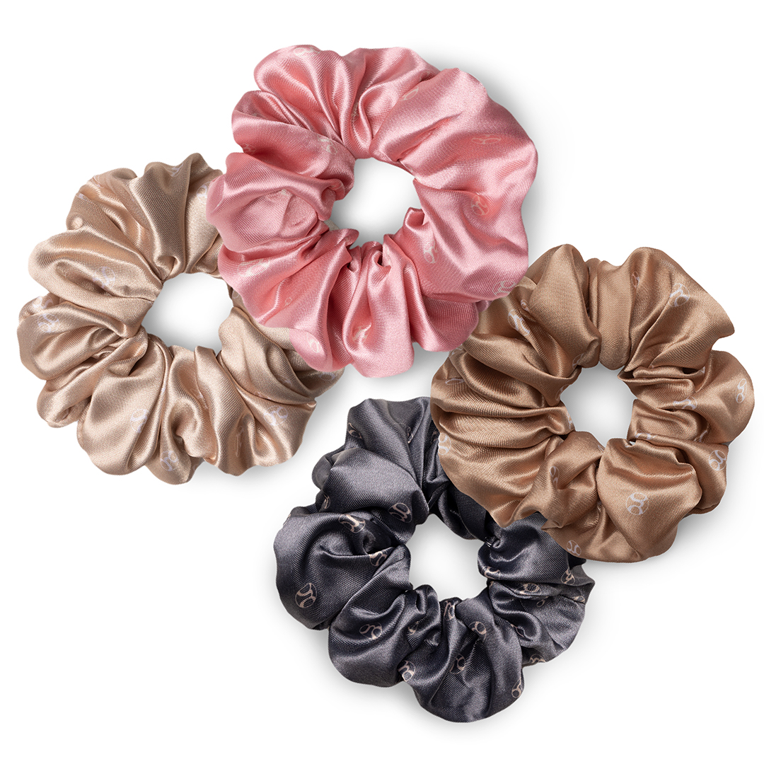 This assorted pack of 4 contains 1 charcoal, 1 pink, 1 rich cream, and 1 golden Satin Scrunchie.